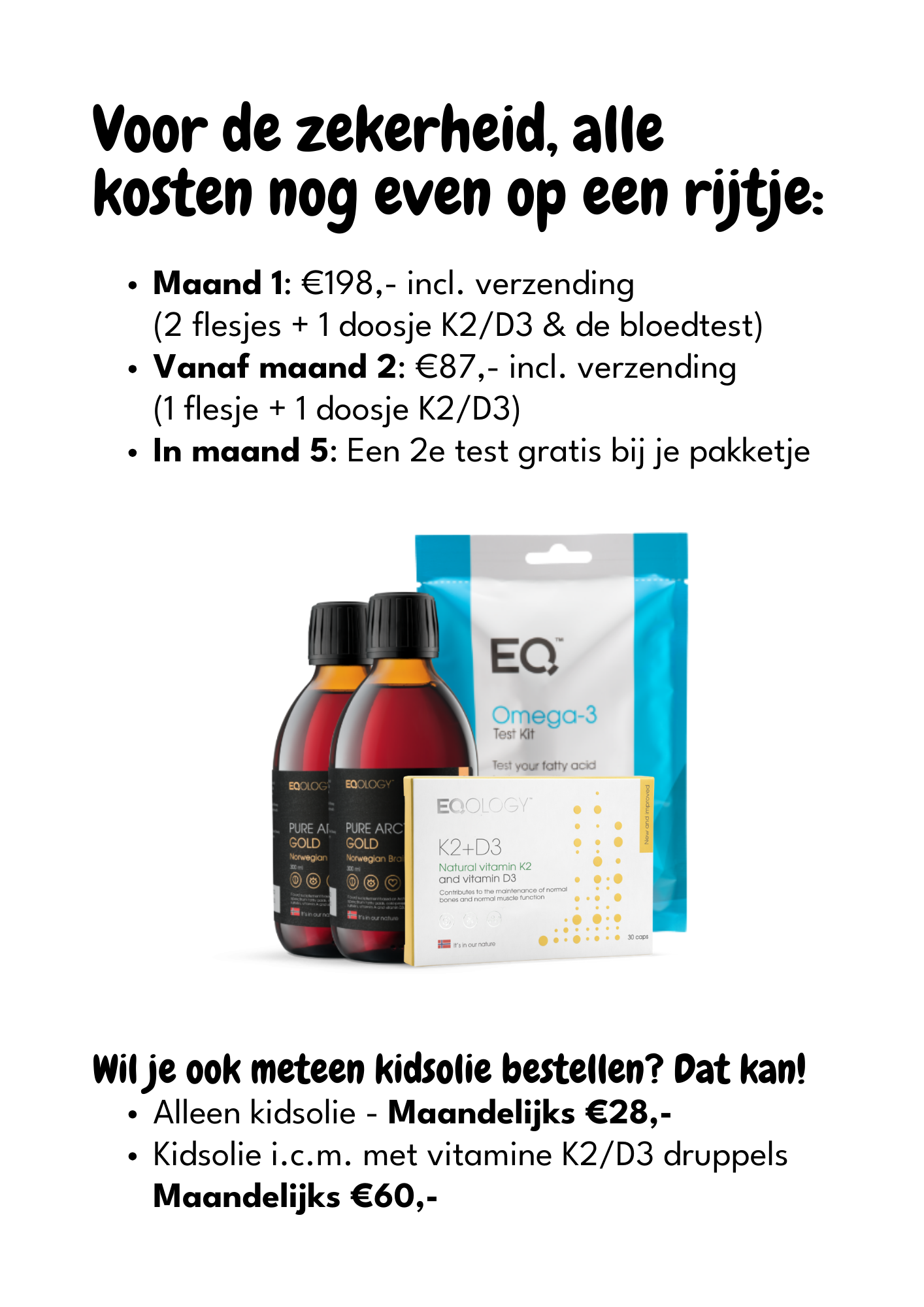 Met het plaatsen van de bestelling ga je akkoord met de aankoop van een halfjaartraject omega 3 & vitamine K2/D3, en zal er maandelijks een automatische afschrijving van het ingevulde bankrekeningnummer plaatsvinden. Daarnaast ga je akkoord met het verwerken van jouw gegevens en het aanmaken van een Eqology-account.