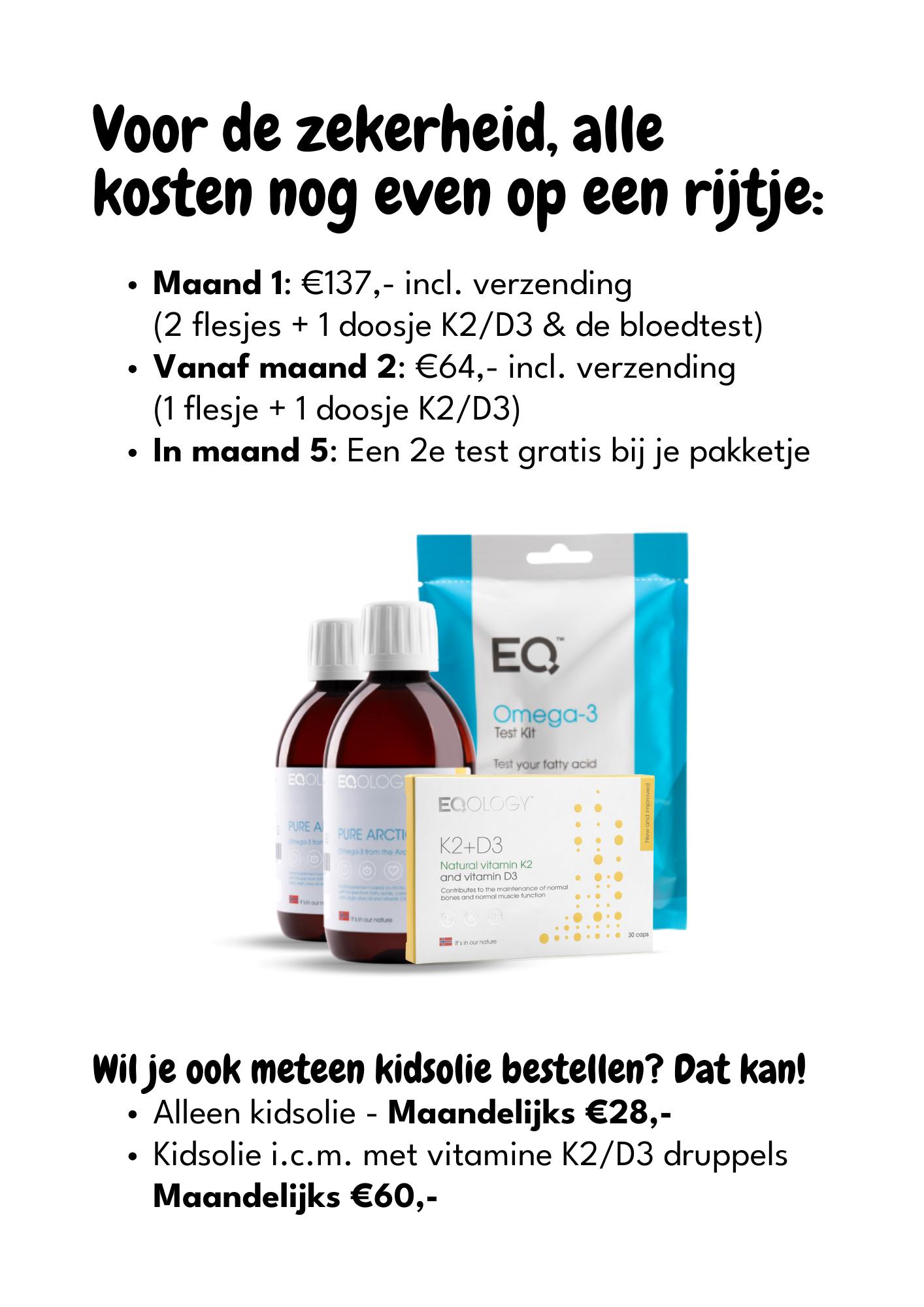 Met het plaatsen van de bestelling ga je akkoord met de aankoop van een halfjaartraject omega 3 & vitamine K2/D3, en zal er maandelijks een automatische afschrijving van het ingevulde bankrekeningnummer plaatsvinden. Daarnaast ga je akkoord met het verwerken van jouw gegevens en het aanmaken van een Eqology-account.
